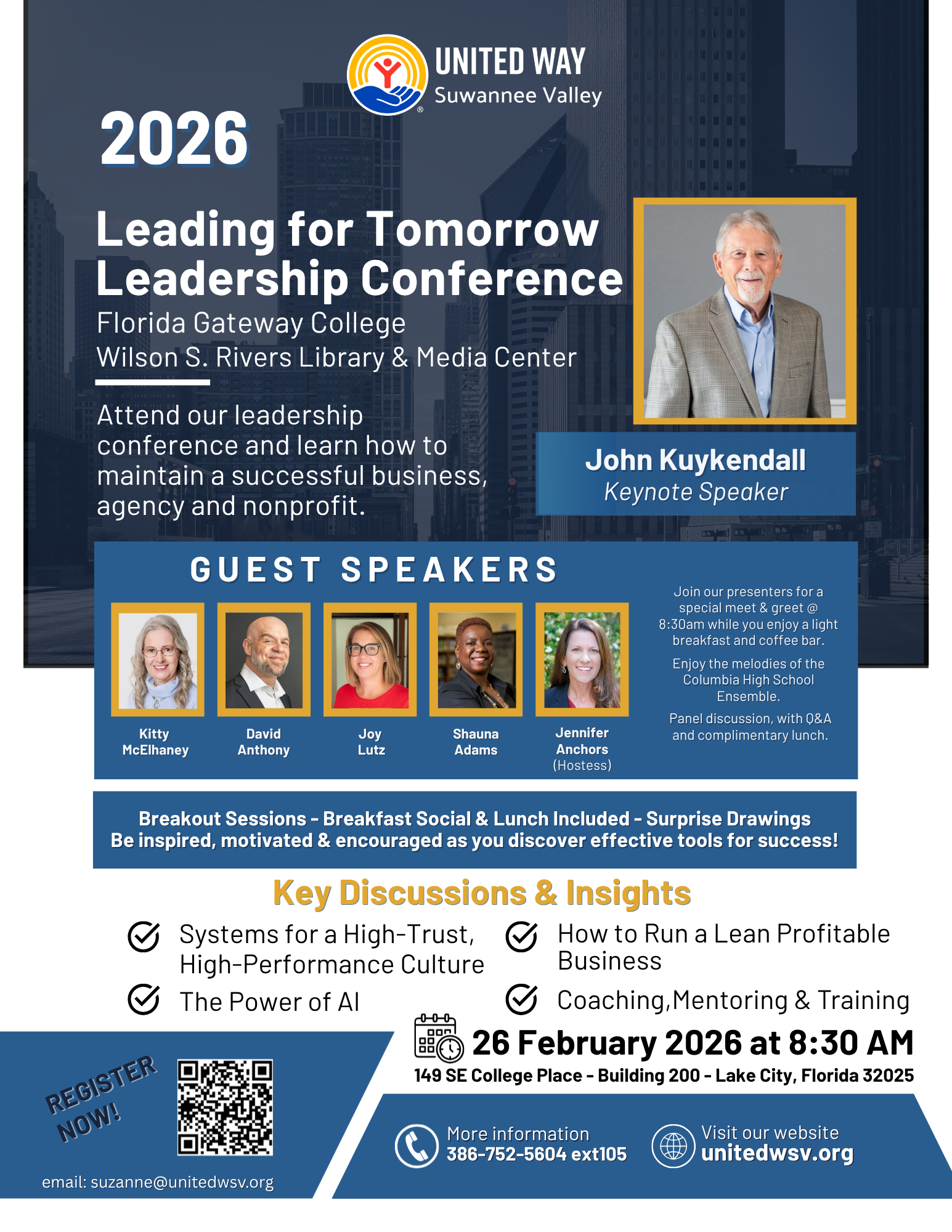 Recognizing the importance of these opportunities, the current challenges in this area and the desire for local training, the United Way of Suwannee Valley is convening this Conference to promote leadership and capacity building for our local partnerships. This year we will bring to our community the Fifth Annual Leading for Tomorrow Leadership Conference. This event will be for leaders, staff members, board members, community volunteers, and interested citizens from both the public and private sector.