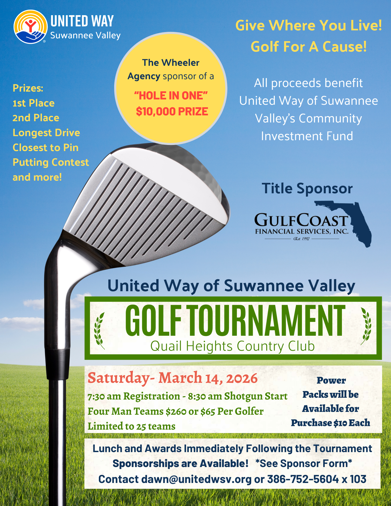 Prizes: 1st and 2nd place, Longest Drive, Closest to Pin, Putting Contest and more!